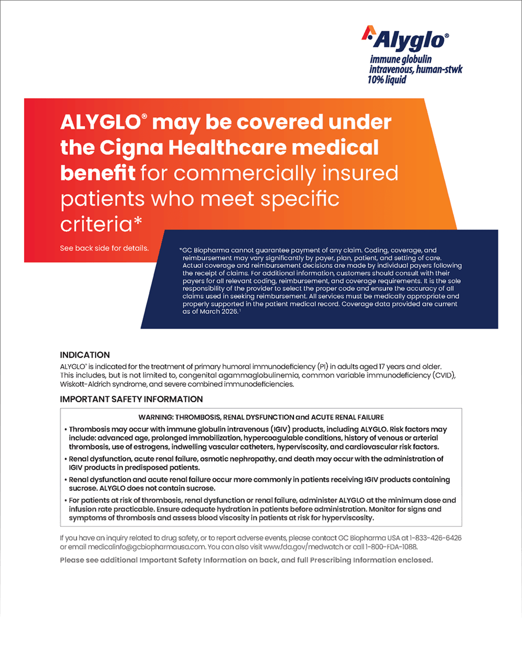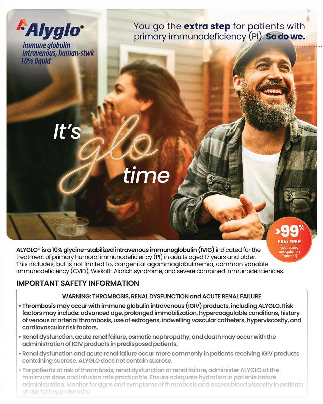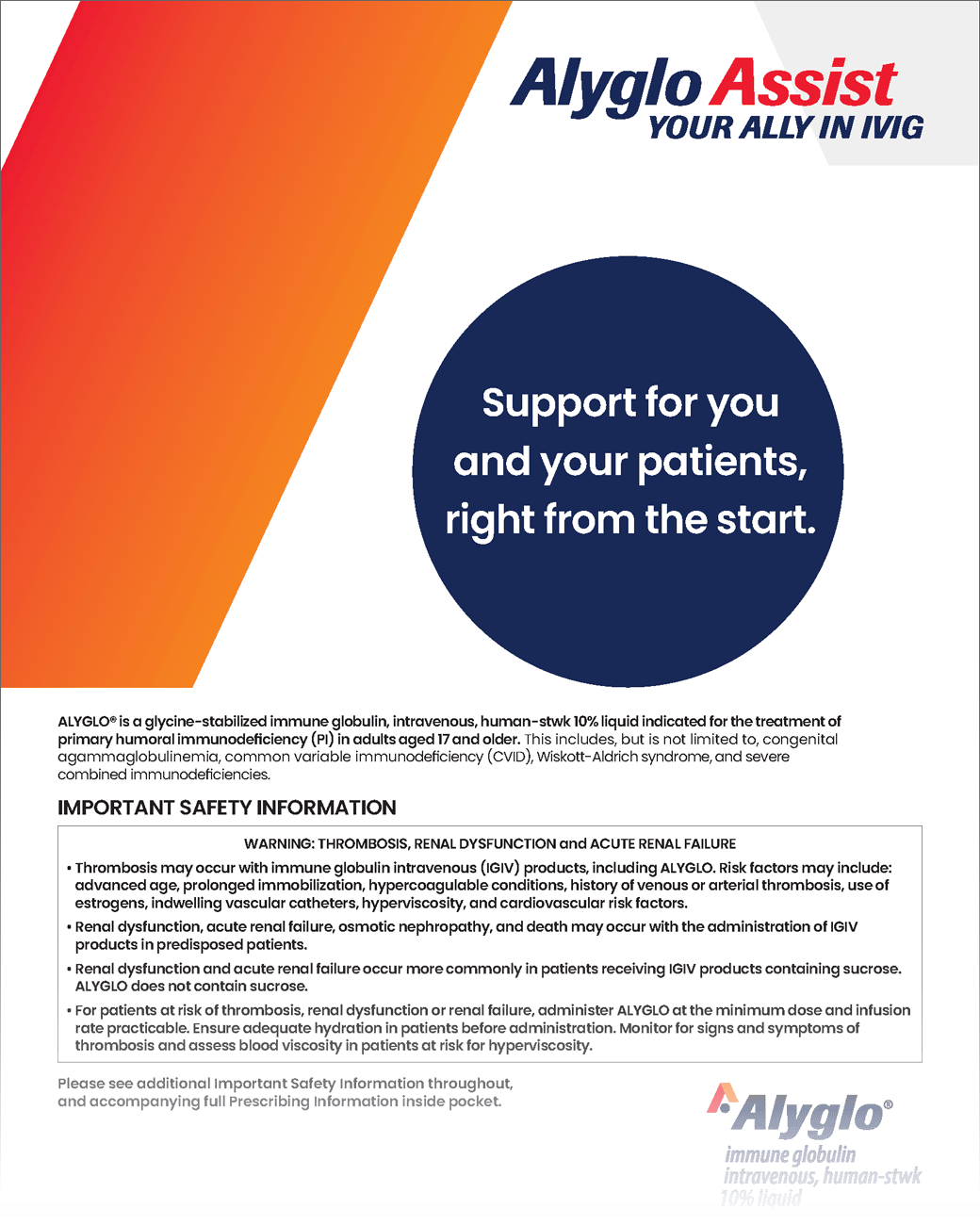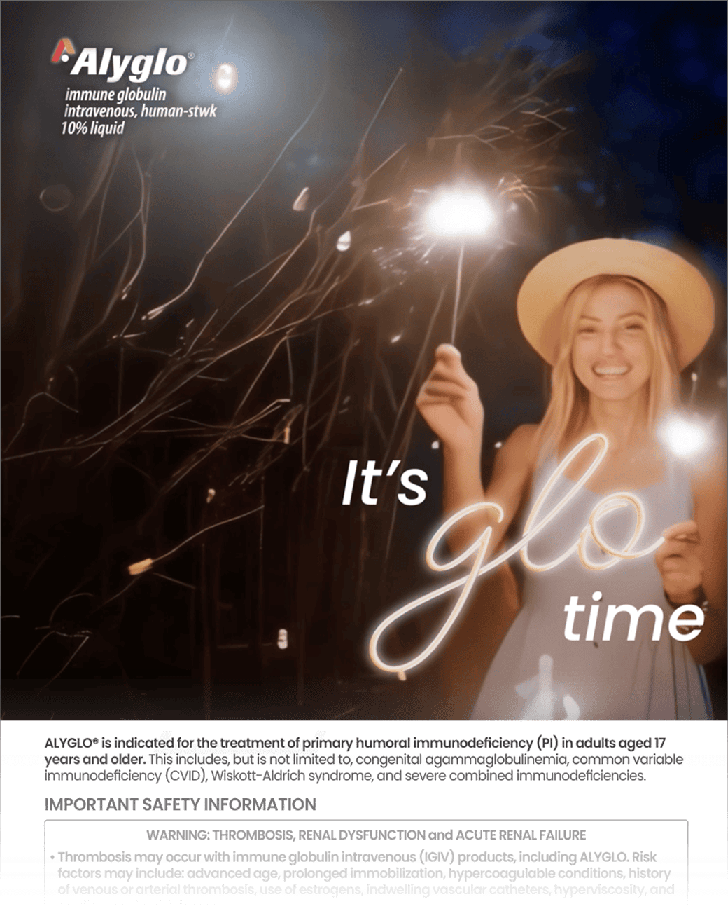ALYGLO® is indicated for the treatment of primary humoral immunodeficiency (PI) in adults aged 17 years and older. This includes, but is not limited to, congenital agammaglobulinemia, common variable immunodeficiency (CVID), Wiskott-Aldrich syndrome, and severe combined immunodeficiencies.