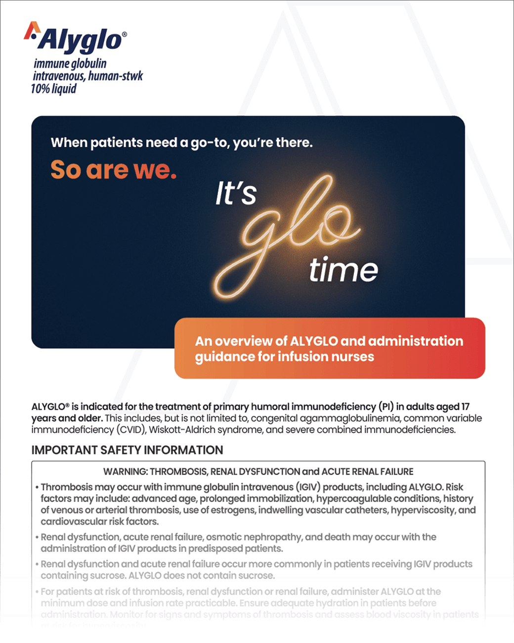 ALYGLO® is indicated for the treatment of primary humoral immunodeficiency (PI) in adults aged 17 years and older. This includes, but is not limited to, congenital agammaglobulinemia, common variable immunodeficiency (CVID), Wiskott-Aldrich syndrome, and severe combined immunodeficiencies.